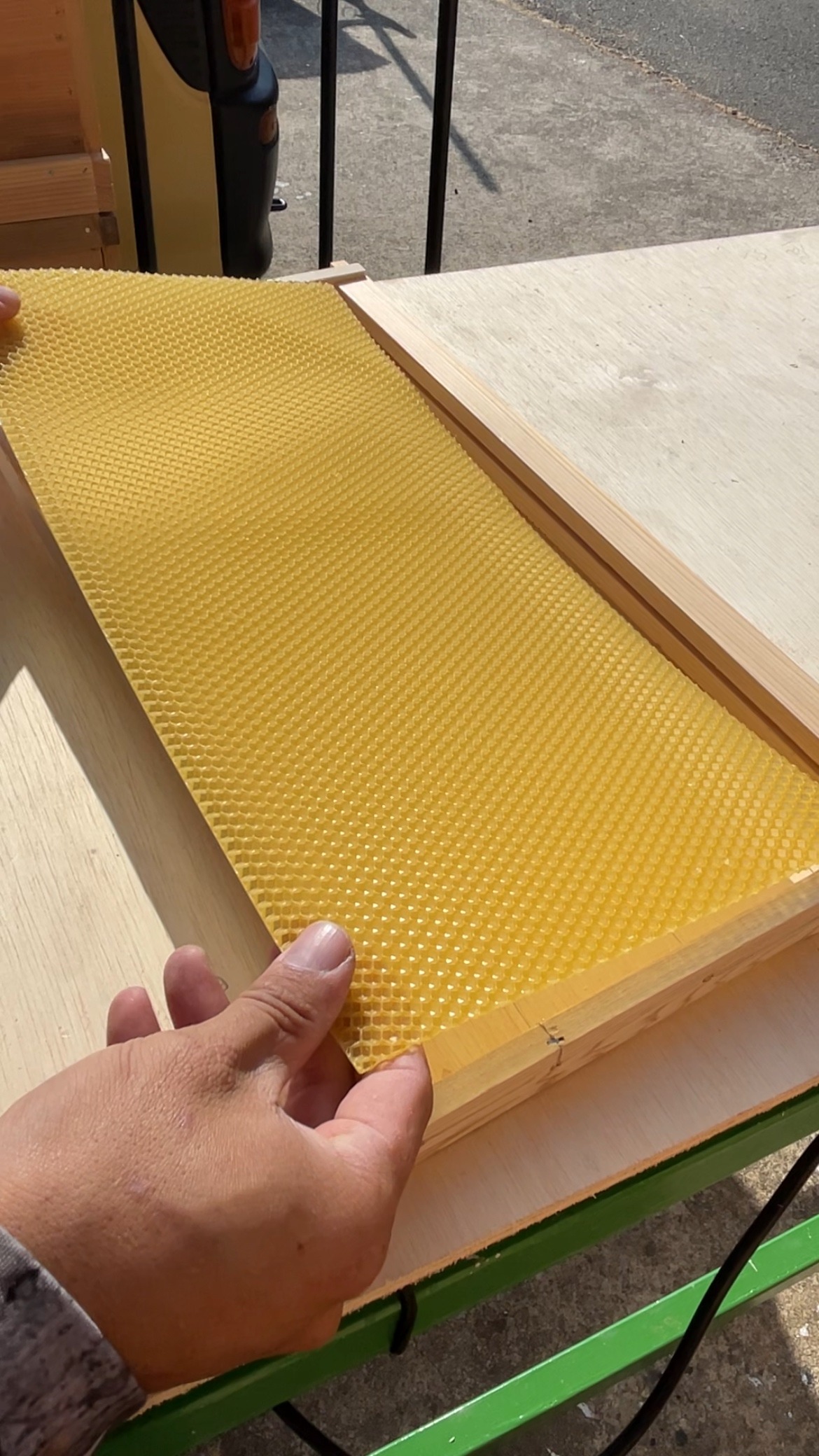 溶けた蜜蝋と針金が密着して巣枠に蜜蝋シートが固定されます。