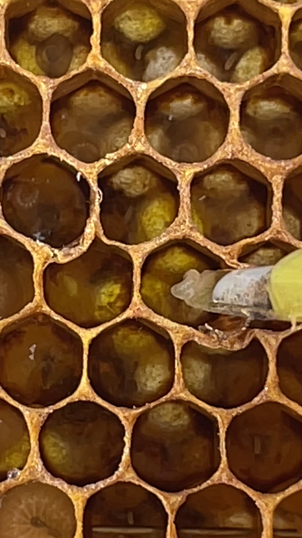 移虫とは、働きバチの幼虫を専用の道具を使って、六角形の巣から取り出し、