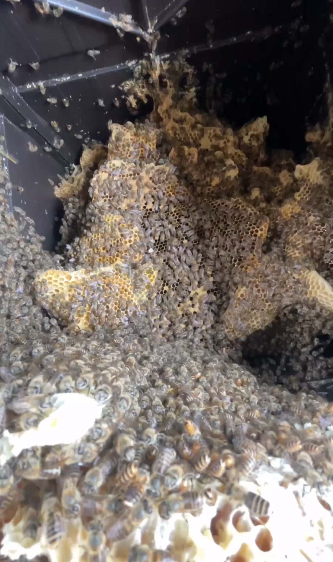 ビルの屋上に置いていたプラスチック容器に分蜂した日本蜜蜂が住みついたそうです。